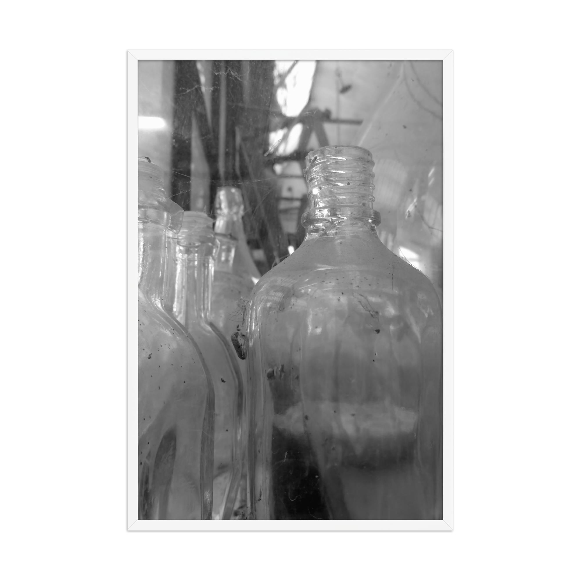 La imagen en blanco y negro muestra una serie de botellas de vidrio antiguas y polvorientas. La acumulación de suciedad, telarañas y pequeñas imperfecciones sobre el vidrio aporta una sensación de abandono y nostalgia, como si el tiempo se hubiera detenido alrededor de estos objetos olvidados.