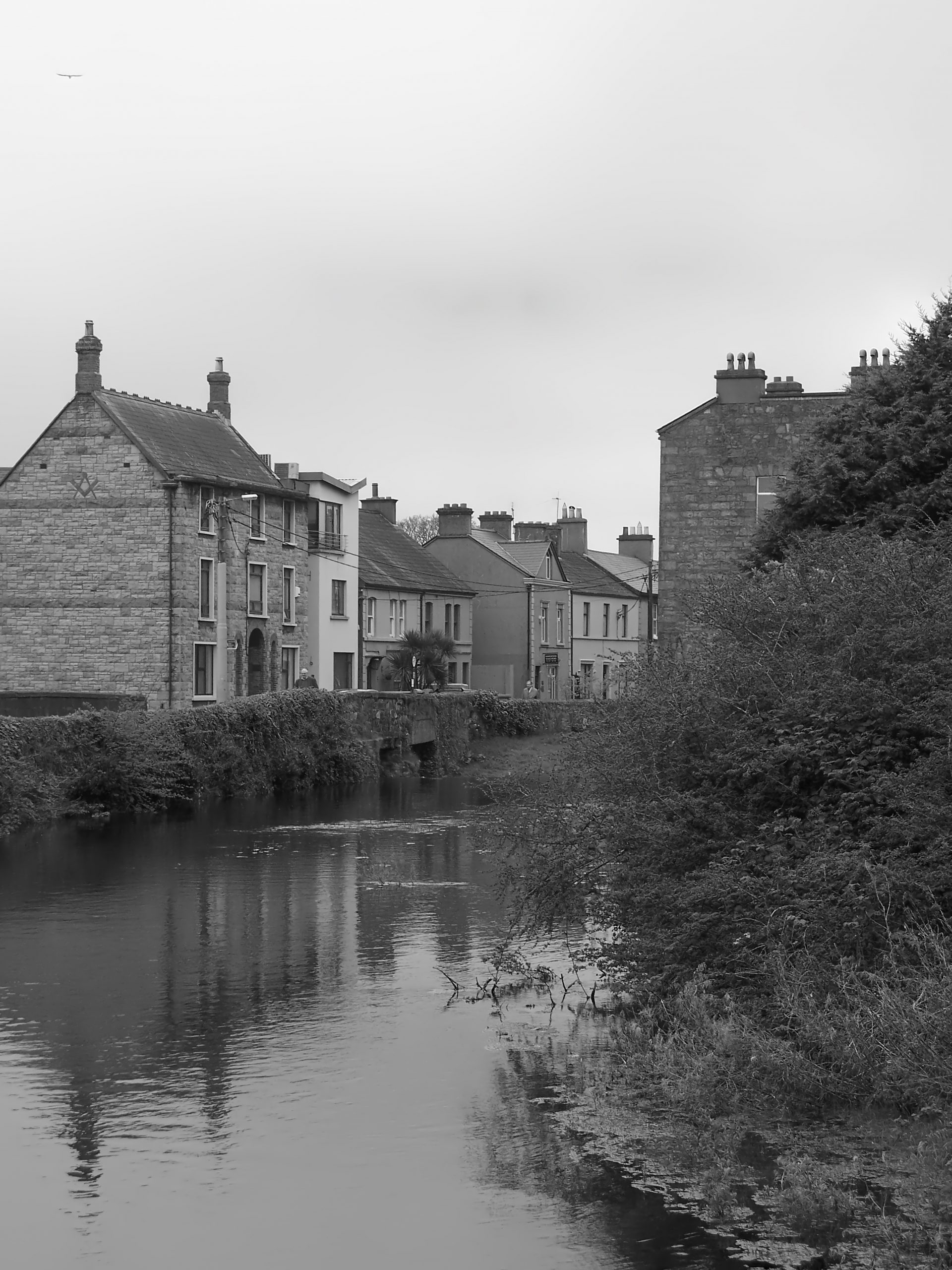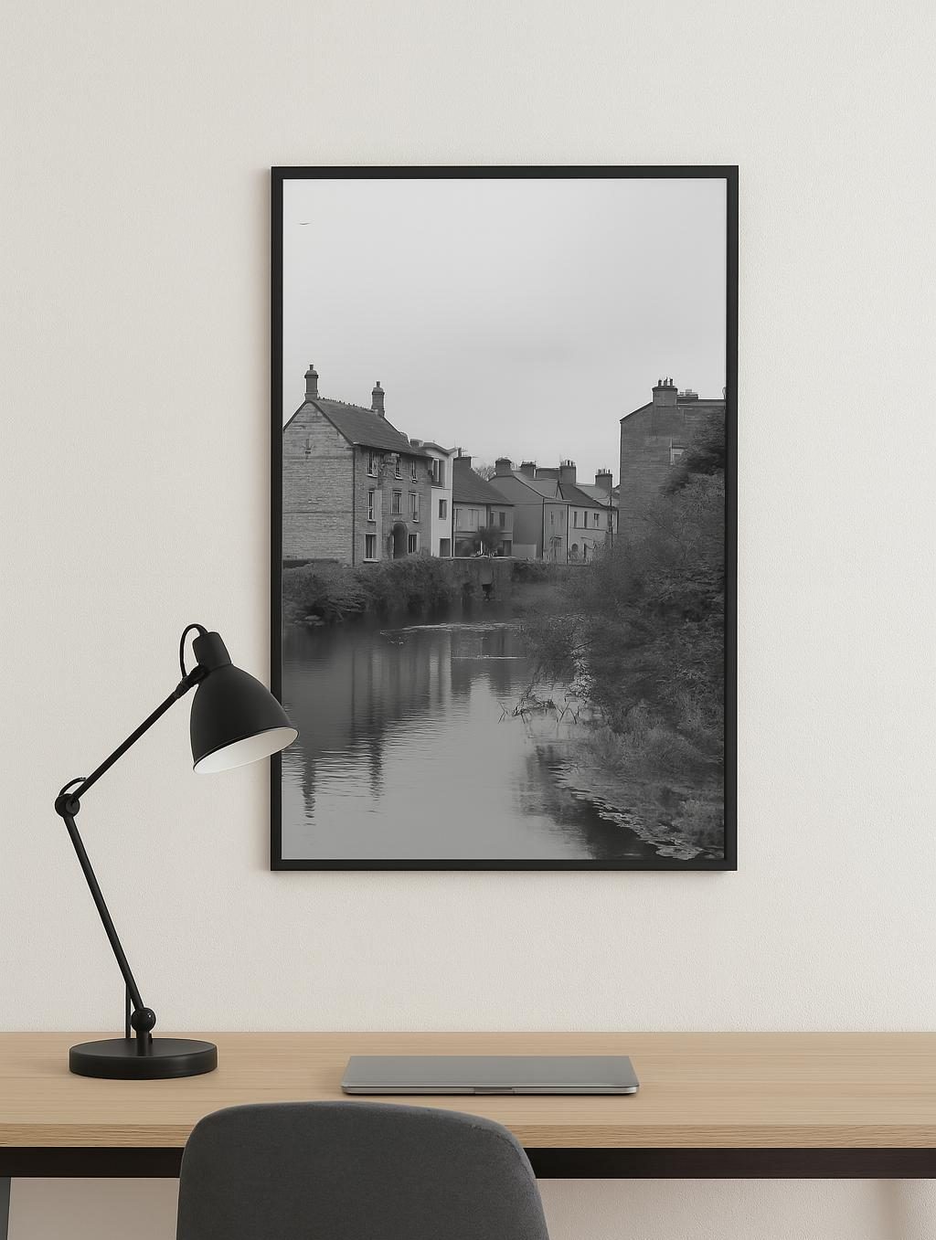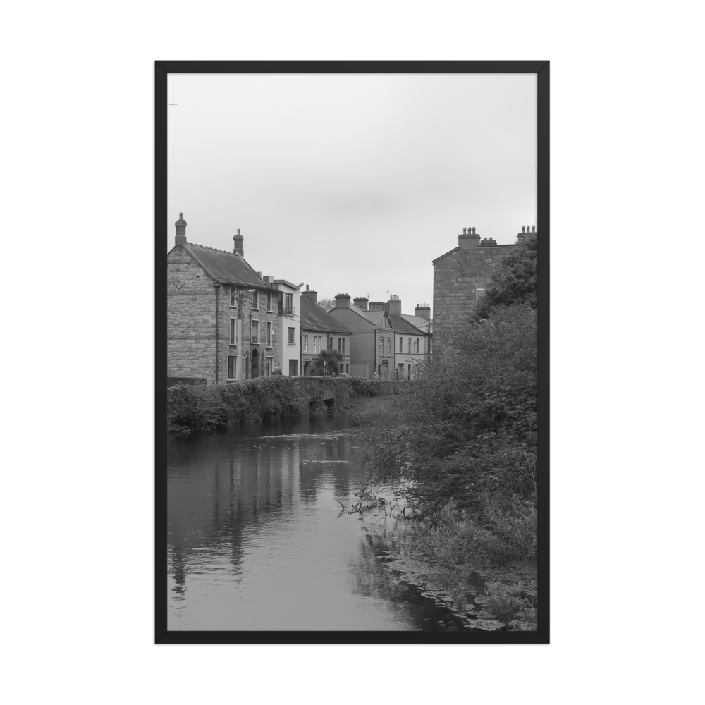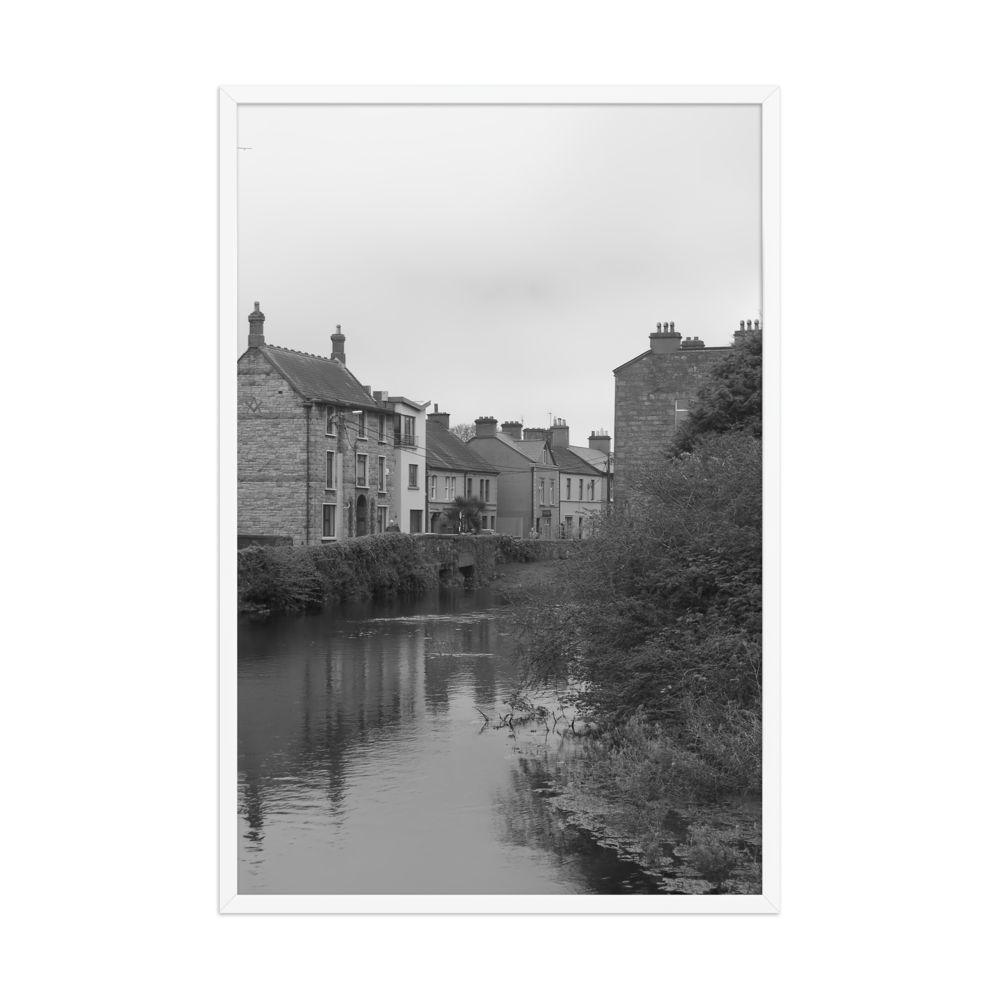 Fotografía vertical en blanco y negro tomada en Irlanda. Un rincón silencioso con reflejos sobre el canal, ideal para decorar con calma y carácter.