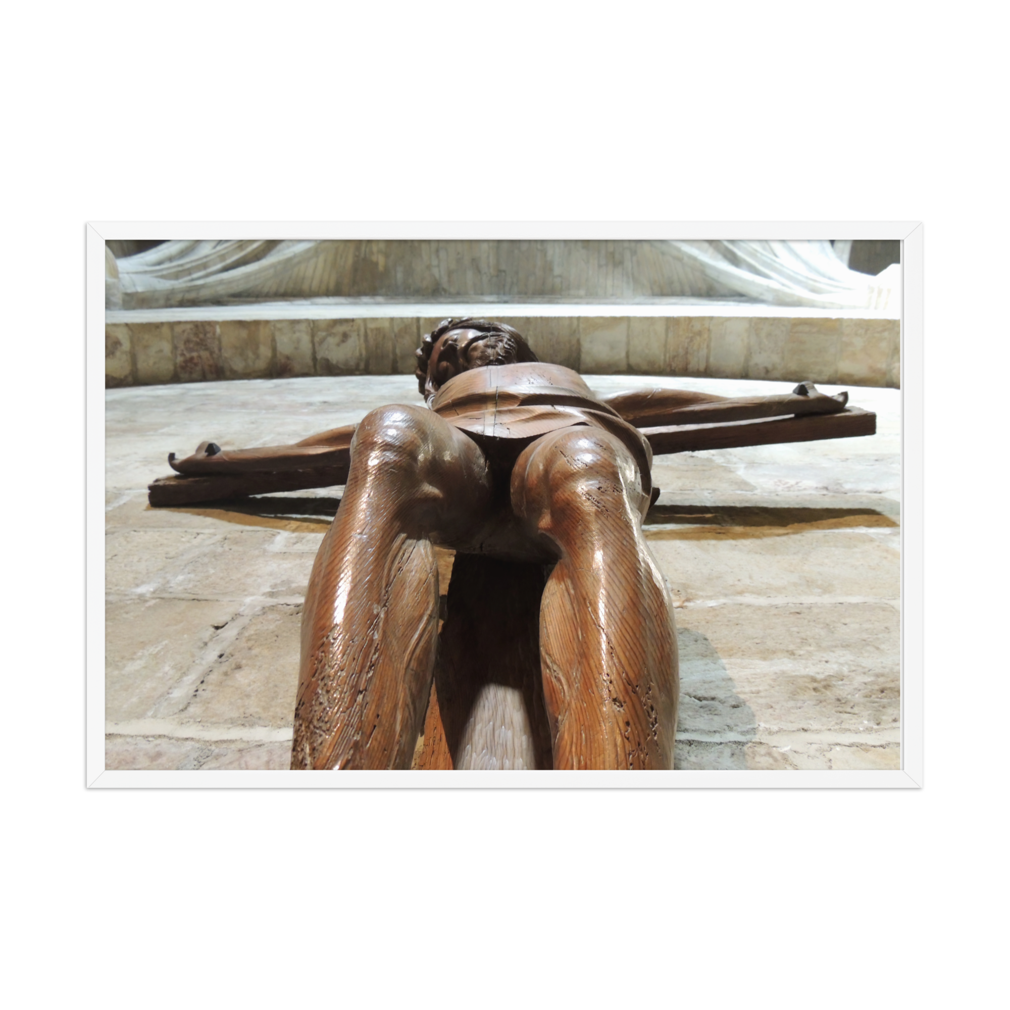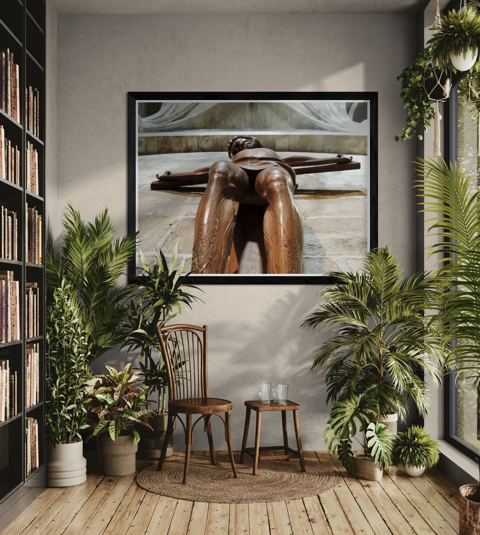 Lámina artística de escultura religiosa tallada en madera. Fotografía con fuerza espiritual y ángulo original para decorar con significado.