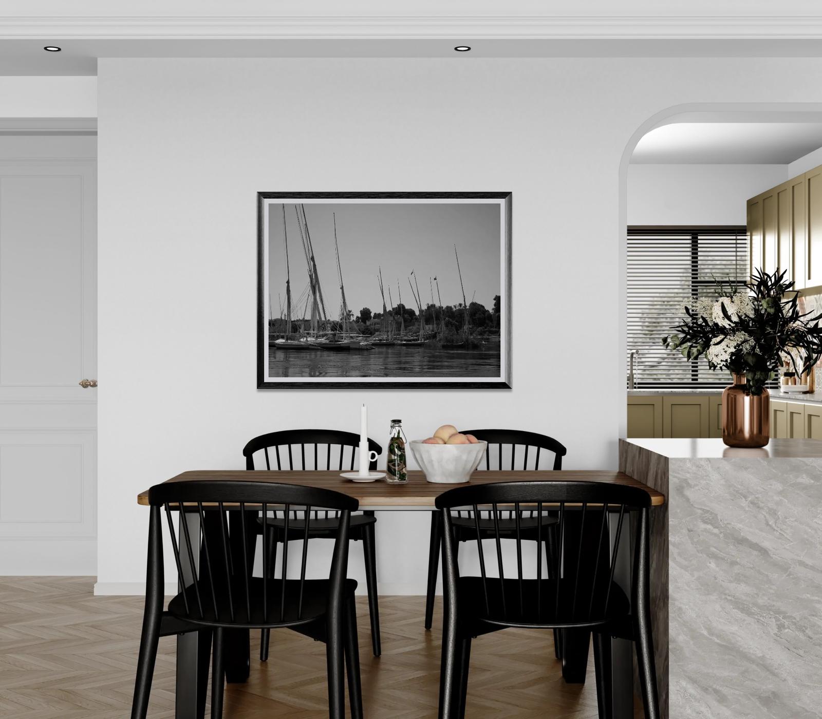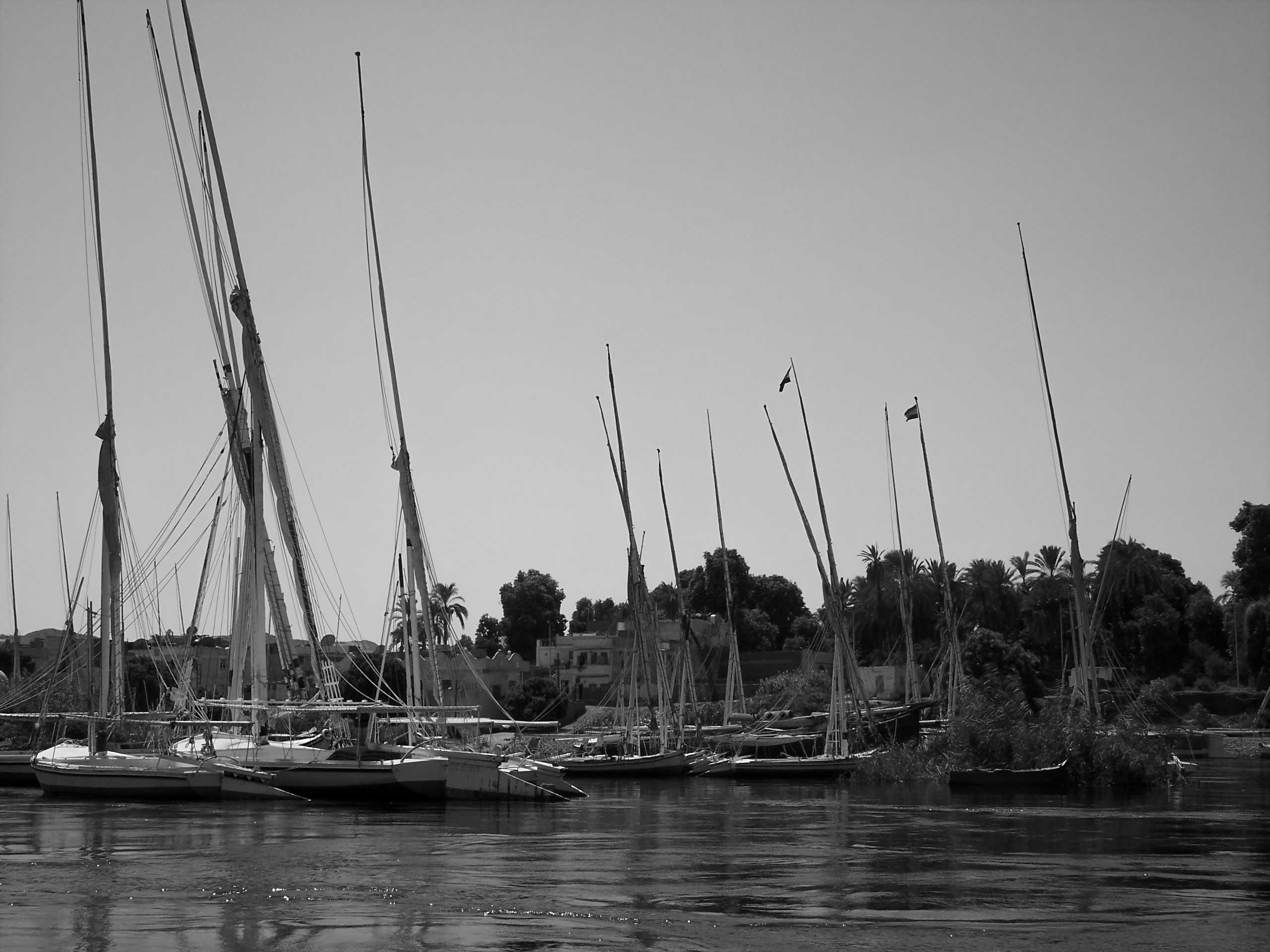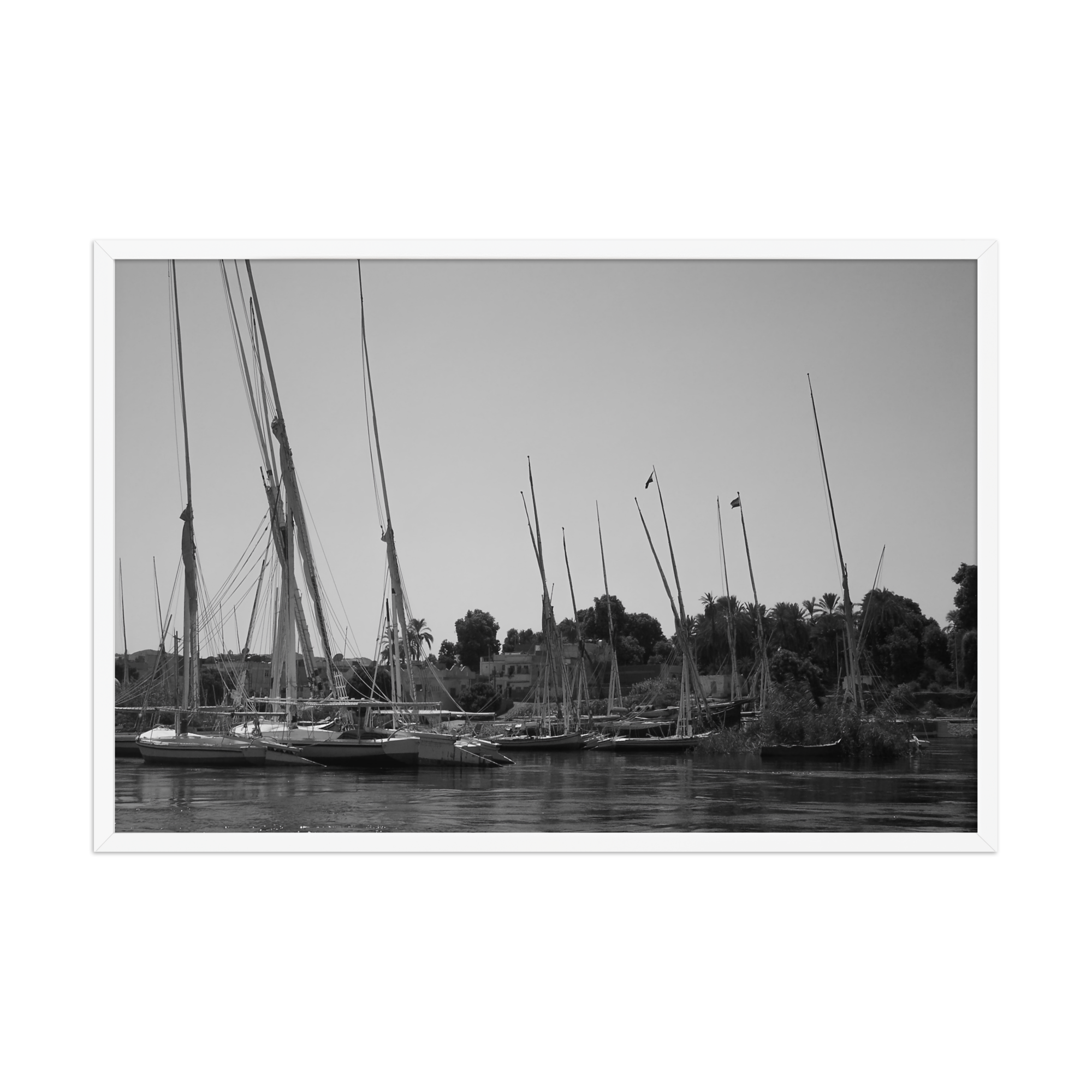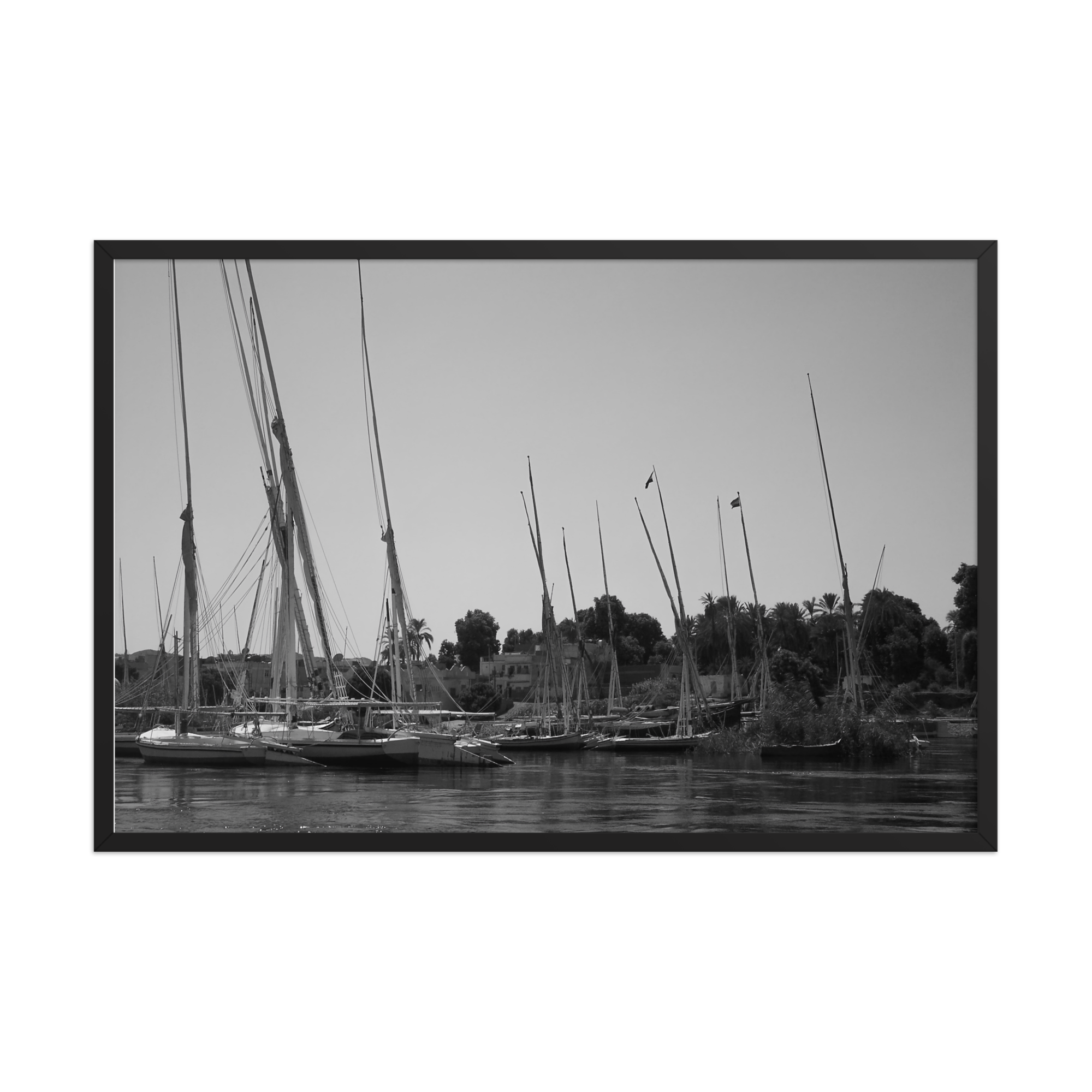 A orillas del majestuoso Nilo, un grupo de falucas reposa tranquilamente con sus esbeltas velas apuntando al cielo. Las embarcaciones, alineadas junto a la vegetación exuberante, reflejan una escena de quietud y tradición. El paisaje tropical, con palmeras y construcciones bajas, enmarca el ambiente sereno. Todo en la imagen evoca un instante eterno en tierras egipcias.