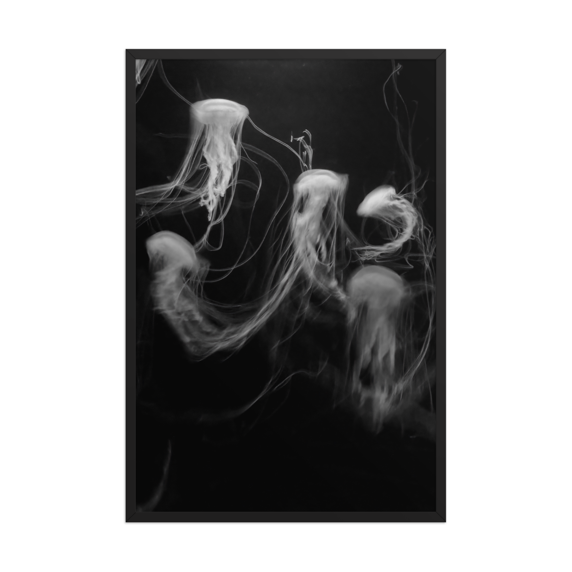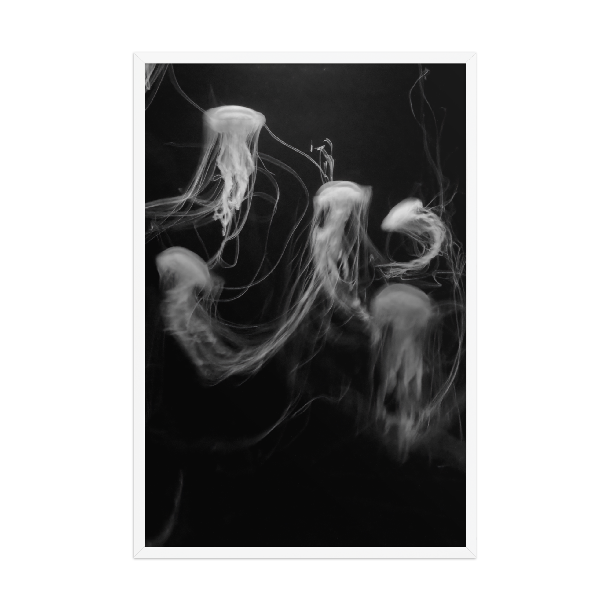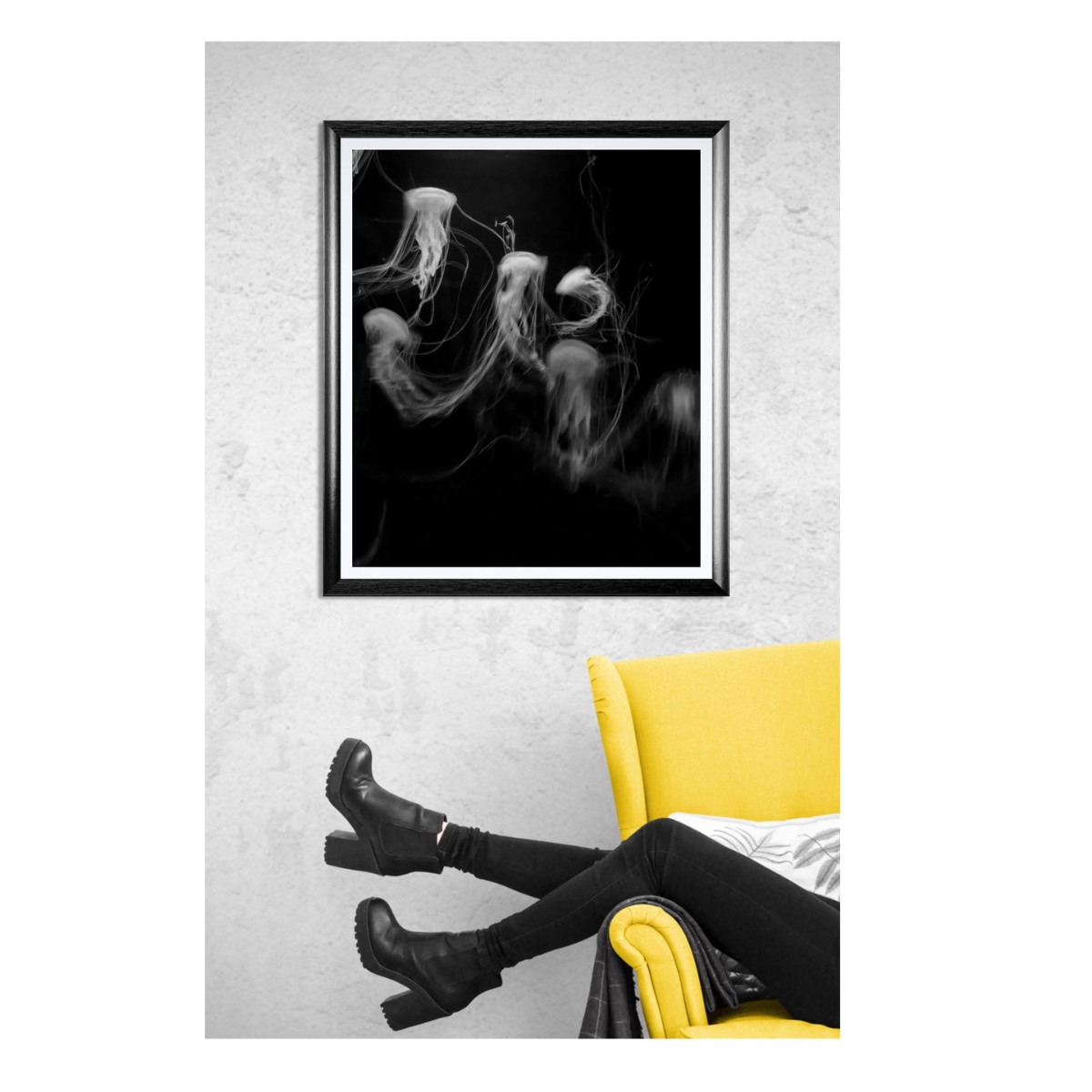 Una danza sin ruido. Esta lámina de medusas en blanco y negro envuelve el espacio en una calma que casi se escucha.