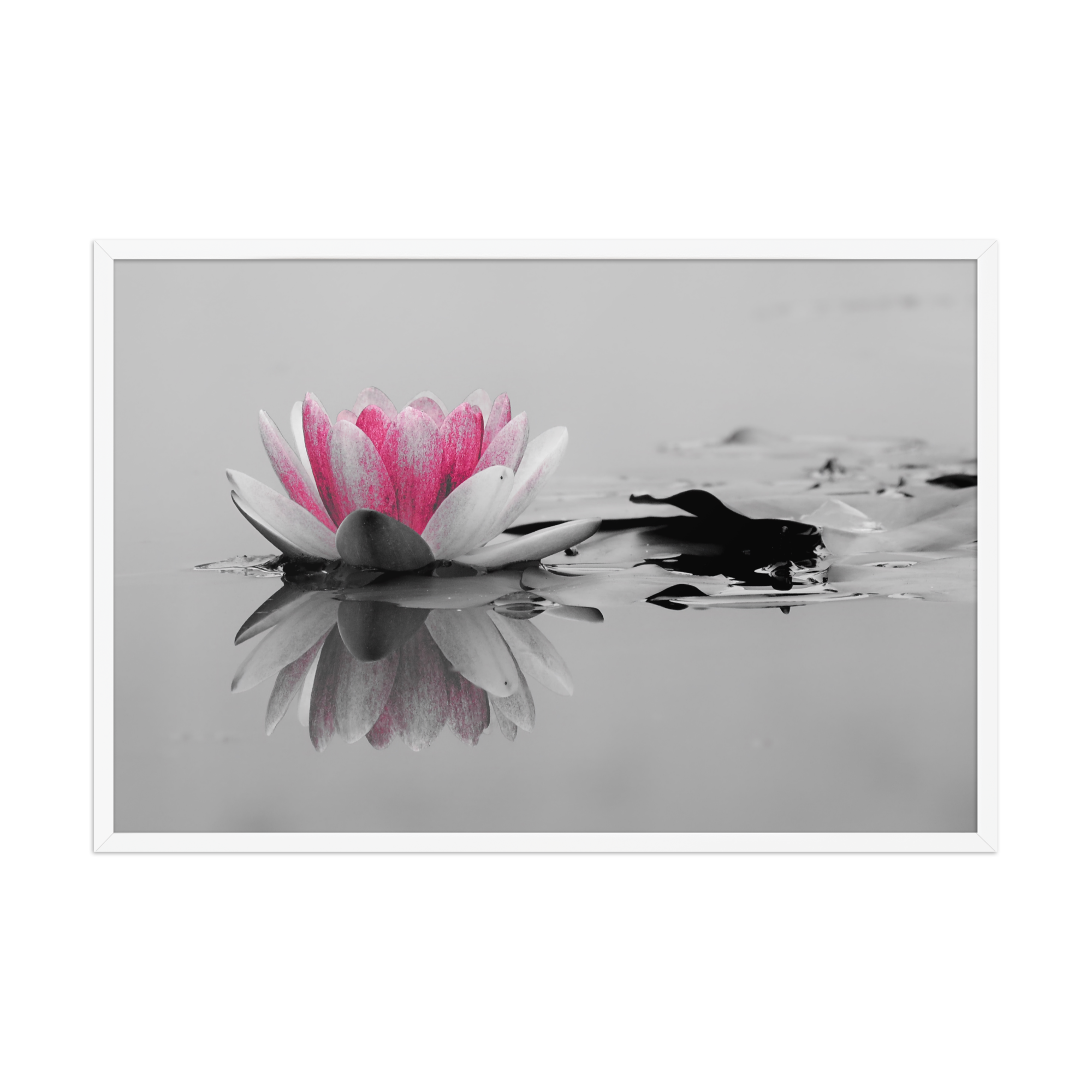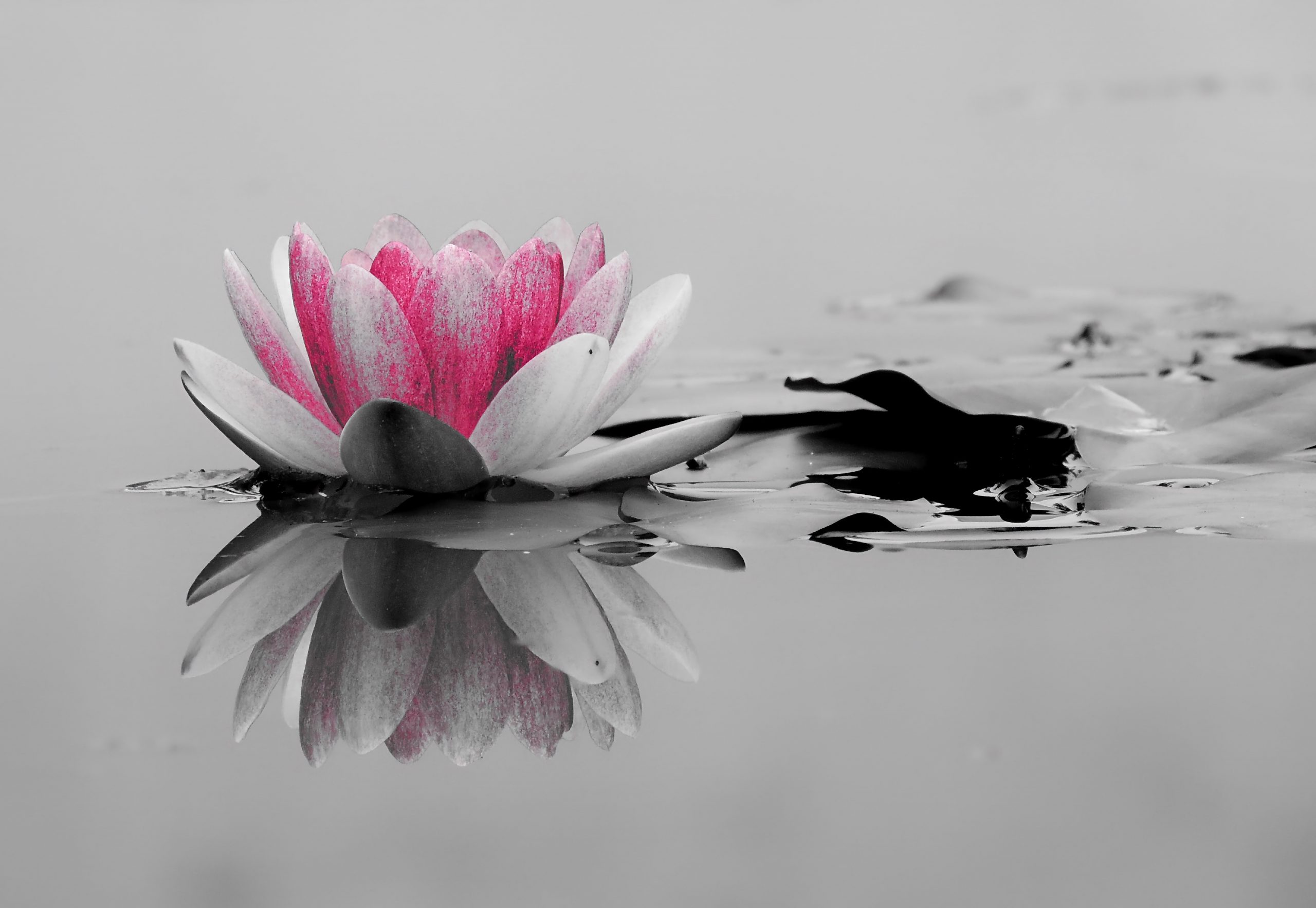 En la imagen, una flor de loto se alza delicadamente sobre la superficie tranquila del agua, destacando con sus pétalos rosados en un entorno en blanco y negro que realza su belleza serena. Su reflejo casi perfecto en el agua crea una sensación de armonía y equilibrio, mientras que el contraste cromático aporta un aire poético y contemplativo, como si la flor simbolizara la pureza que emerge del silencio.