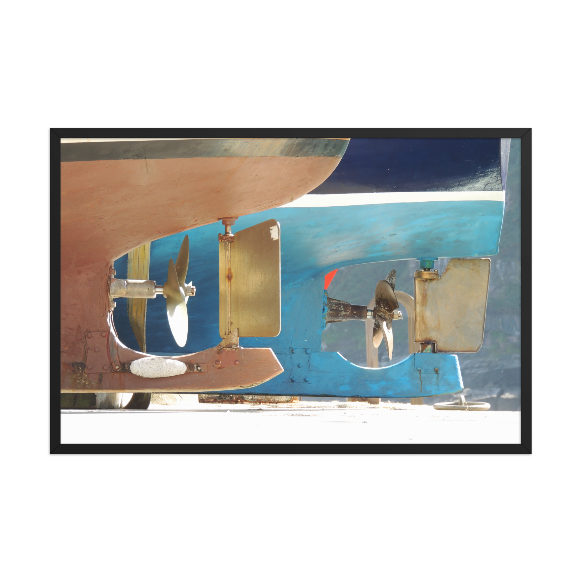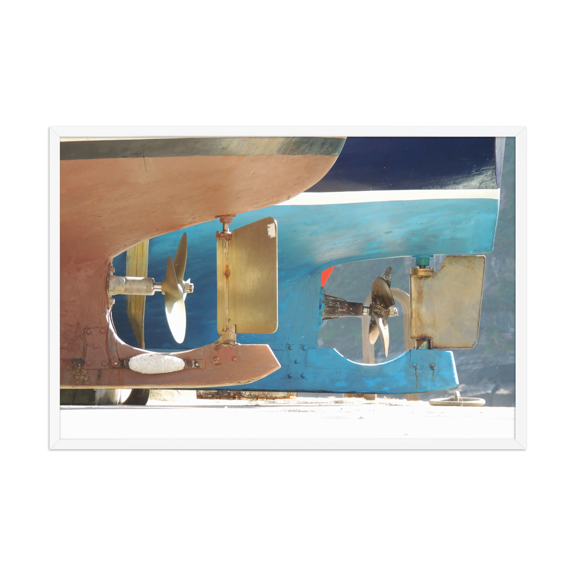 La imagen muestra la parte inferior de dos embarcaciones varadas en tierra, donde se aprecian con claridad las hélices metálicas y los timones que sobresalen de sus cascos pintados en tonos cálidos y azulados. La luz resalta los detalles técnicos y el desgaste de las superficies, dejando ver el contraste entre el mantenimiento de una y la oxidación incipiente en la otra. Esta escena, aparentemente simple, revela el universo silencioso de los barcos cuando descansan fuera del agua, preparándose para nuevas travesías.