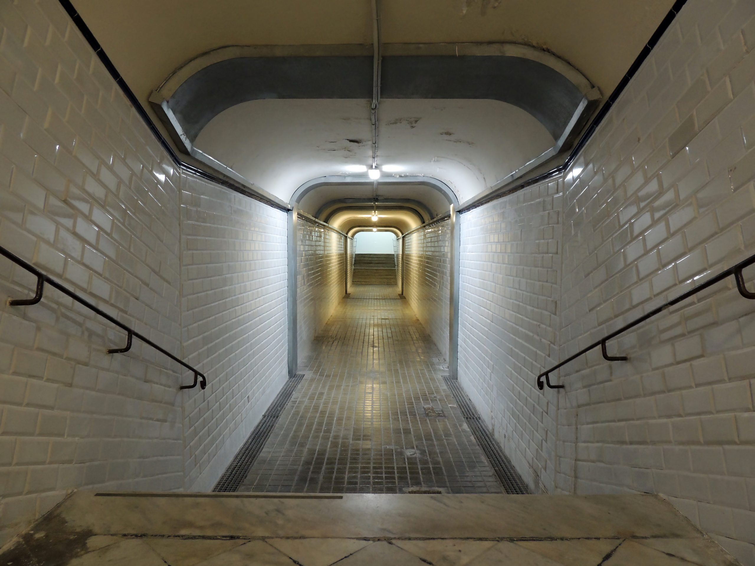 La imagen muestra un pasillo subterráneo de paredes recubiertas con azulejos blancos brillantes, iluminado por una sucesión de luces frías que crean una atmósfera limpia pero ligeramente inquietante. Las líneas del techo curvo, el suelo enrejado y los pasamanos metálicos guían la vista hacia el fondo, donde un tenue resplandor amarillo sugiere una salida o una continuación desconocida. La escena transmite una sensación de tránsito, soledad y expectativa, como un espacio suspendido entre un punto de partida y un destino aún por descubrir.