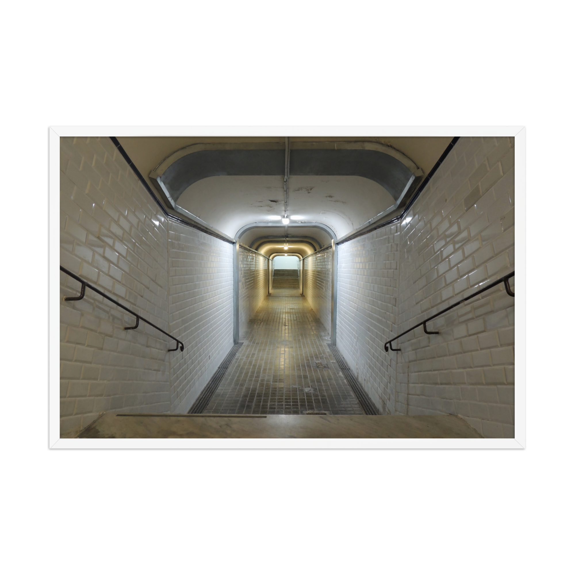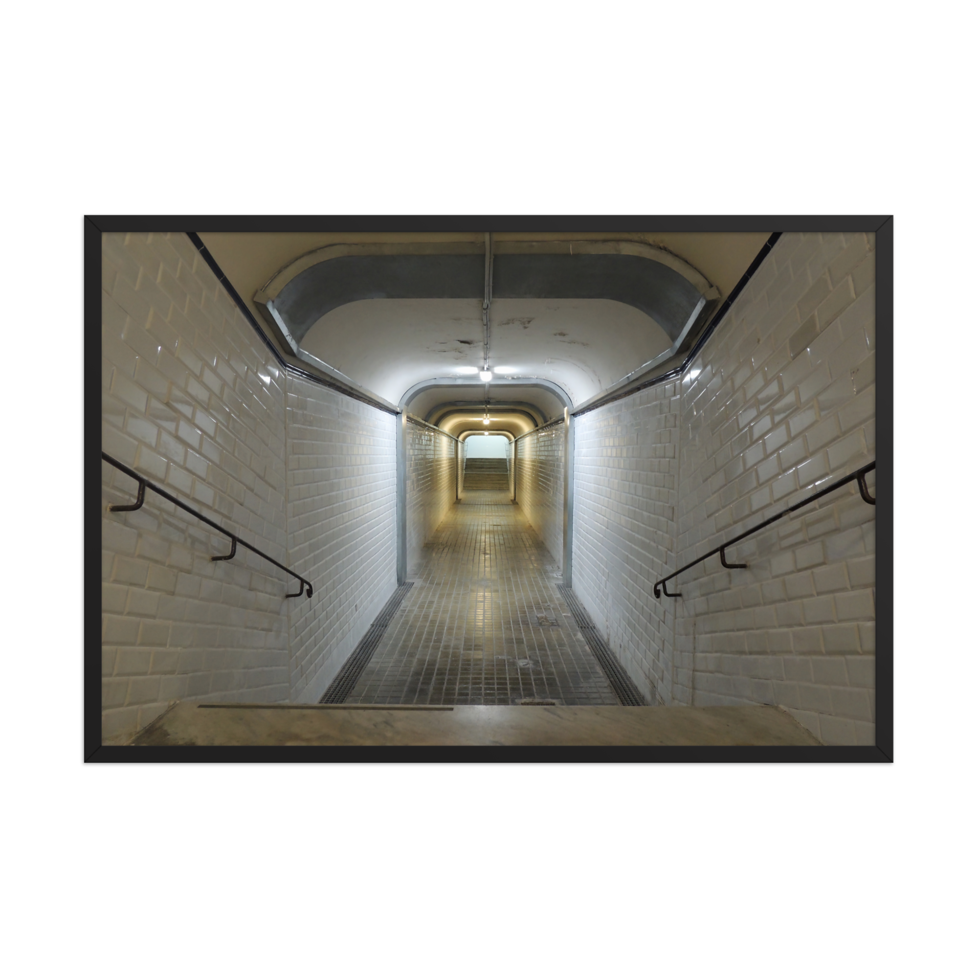 Lámina de edición limitada con fotografía original de un túnel subterráneo, impresa en alta calidad y enmarcada sin paspartú. Un punto de fuga visual perfecto para interiores industriales, galerías personales o espacios con carácter.
